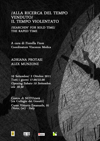 La mostra ALLA RICERCA DEL TEMPO VENDUTO/ IL TEMPO VIOLENTATO (SEARCHIN’ FOR SOLD TIME / THE RAPED TIME), di Adriana Protasi e Alex Munzone, a cura di Fiorella Fiore, con il coordinamento di Vincenzo Medica, sarà inaugurata Sabato 10 Settembre alle ore 18.30 presso il Centro di NOTOrietà (ex Collegio dei Gesuiti) a Noto.