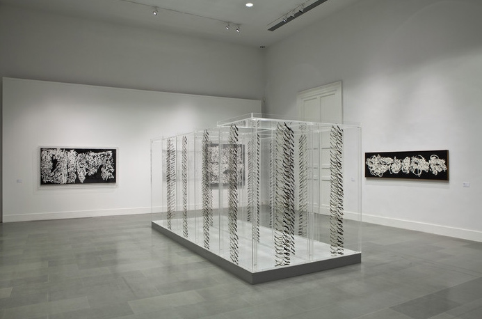 Carla AccardiLe prime sale sono dedicate alle articolazioni di quelli che possono essere definiti i ‘segni cromatici’ della Accardi, che iniziano a proliferare sulle tele dei primi anni Cinquanta in configurazioni libere e distese, per poi assumere alla metà del decennio la caratteristica bicromia del positivo/negativo, che determina la superficie tra bianco e nero. Un intenzionale scarto cronologico, nella medesima sala, mette in relazione questi lavori con l’installazione Casa Labirinto del 1999-2000, opera percorribile in cui il plexiglas è attraversato da segni grigi e neri, proponendo un confronto diretto tra le diramate stagioni espressive di Accardi.