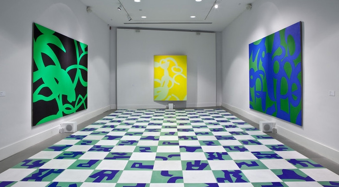 Carla AccardiAl piano superiore, la mostra presenta una straordinaria sala dedicata ai grandi dipinti realizzati dall’artista per la sua sala personale alla Biennale di Venezia del 1988, per culminare con Pavimento in ceramica (2007), grande lavoro che realizza la fusione di architettura e segno: pavimento di piastrelle in gres dipinto, con segni alternati di colore verde e cobalto su sfondo bianco, che intende anche rimandare a un forte legame con la tradizione creativa delle arti applicate in Sicilia ed è stata realizzata a quattro mani con Gianna Nannini, che ha concepito per essa un suo brano come specifica presenza sonora parallela a quella visiva.