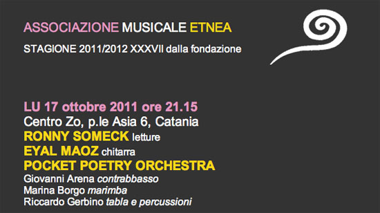 Lunedì 17 ottobre, al Centro Zo di Catania (piazzale Asia 6), alle ore 21:15, uno degli eventi inseriti nel programma della Stagione 2011/2012 dell’Associazione Musicale Etnea: “Israele: musica e poesia del nostro tempo”. Poesie di Ronny Someck e musiche di Eyal Maoz e della Pocket Poetry Orchestra (Giovanni Arena contrabbasso, Marina Borgo marimba, Riccardo Gerbino tabla e percussioni). Introduce Sarah Kaminski.