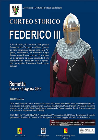 Per valorizzare e promuovere il patrimonio culturale e storico di Rometta, in provincia di Messina, l’Associazione Culturale Marduk organizza, sabato 13 agosto 2011, la IX° Edizione del Corteo Storico.