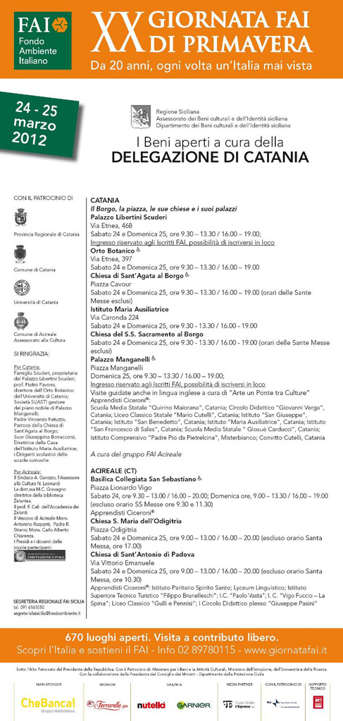 Domani – sabato 24 e domenica 25 marzo – per la “XX Giornata di Primavera”, promossa contemporaneamente in 275 località italiane dal Fai (Fondo Ambiente Italiano) e organizzata nella città etnea dalla delegazione di Catania guidata da Antonella Mandalà – sarà possibile andare alla scoperta dei palazzi più antichi e pregni di significato della nostra storia sociale, architettonica e culturale.