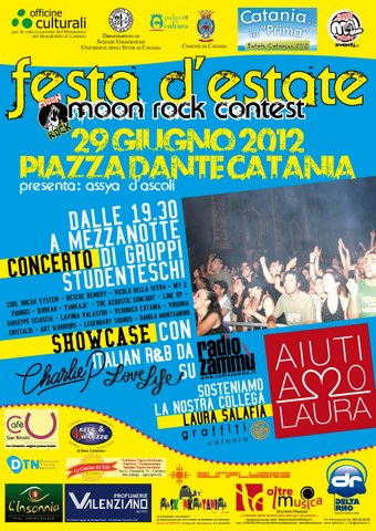 Per dare il benvenuto all’estate catanese, venerdì 29 giugno Piazza Dante ospiterà la Festa d’Estate 2012 organizzata dal Dipartimento di Scienze Umanistiche (DISUM) in collaborazione con Officine Culturali e MoonLight Eventi. A partire dalle 19:30, il sagrato della chiesa di San Nicolò l’Arena diventerà il palcoscenico inusuale e spettacolare per la musica dei gruppi studenteschi che si sfideranno in un contest rock.