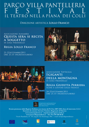 Al parco Villa Pantelleria a Palermo – Festival il teatro nella piana dei colli – sono in programma due eventi teatrali: “Questa sera si recita a soggetto” (21 e 22 settembre 2011) e “I giganti della montagna” (24 e 25 settembre 2011) di Luigi Pirandello.