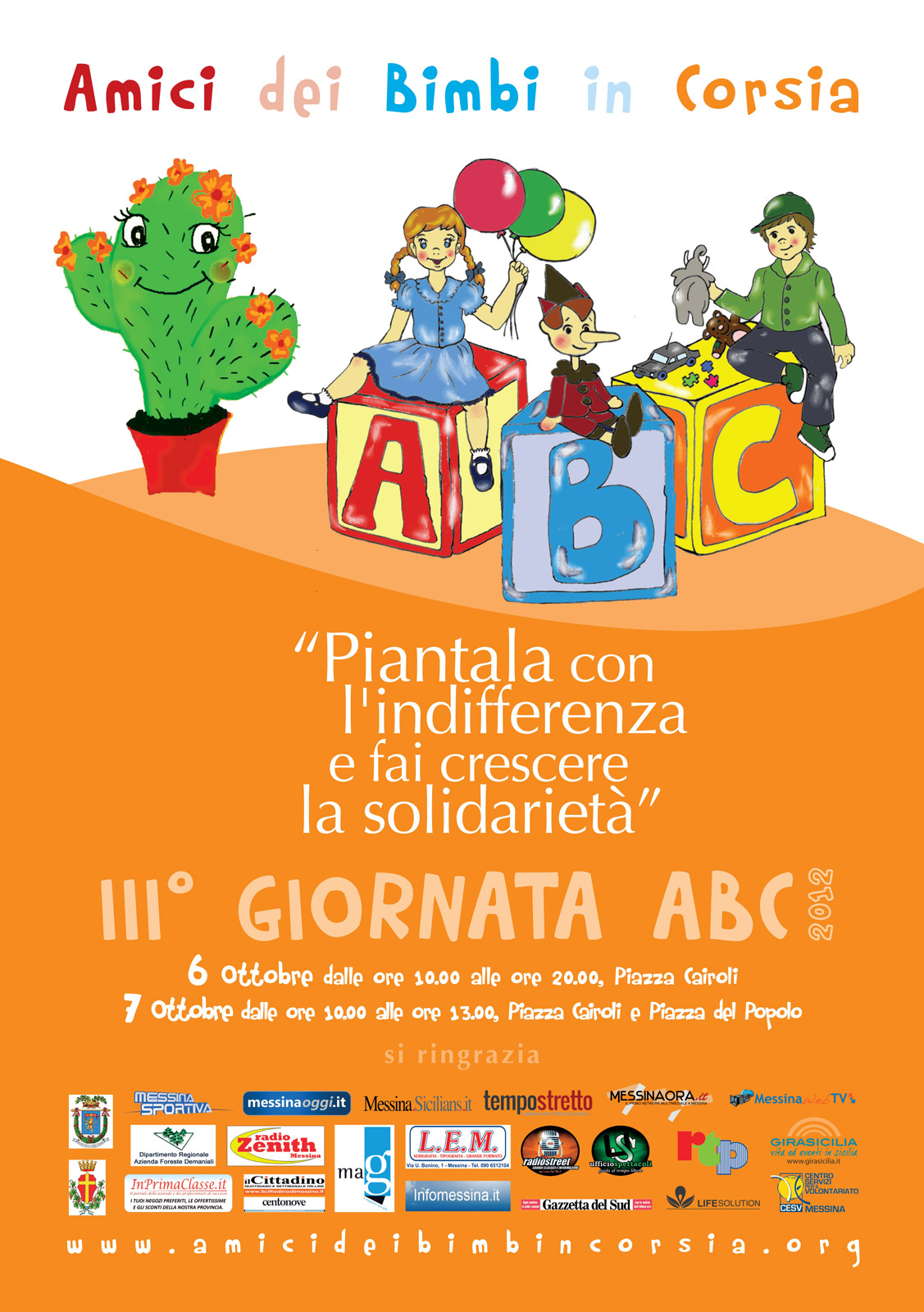 L’associazione Abc Amici dei bimbi in corsia Onlus si ritroverà sabato 6 ottobre dalle 9.00 alle 20.00 a Piazza Cairoli e domenica 7 ottobre 2012 dalle 9.00 alle 13.00 sia a Piazza Cairoli che a Piazza del Popolo per raccogliere fondi per i bambini ospedalizzati dell’ A.O. Policlinico “G. Martino” di Messina.