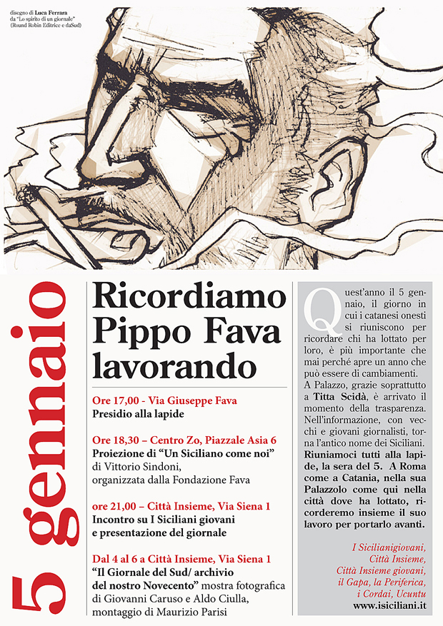 Non vogliamo cadere nella banale retorica delle ricorrenze, ma pensiamo che la figura, le sue parole, il suo lavoro e la vita di Giuseppe Fava abbiano contribuito a fare sentire questa terra e i siciliani un pò più liberi. Liberi anche di scrivere. Dopo tre, quattro e forse cinque generazioni di siciliani sanno che se un comune blog, portale, sito web sia anche merito di Fava. Ecco perchè segnaliamo il programma del 5 gennaio 2012 a Catania.