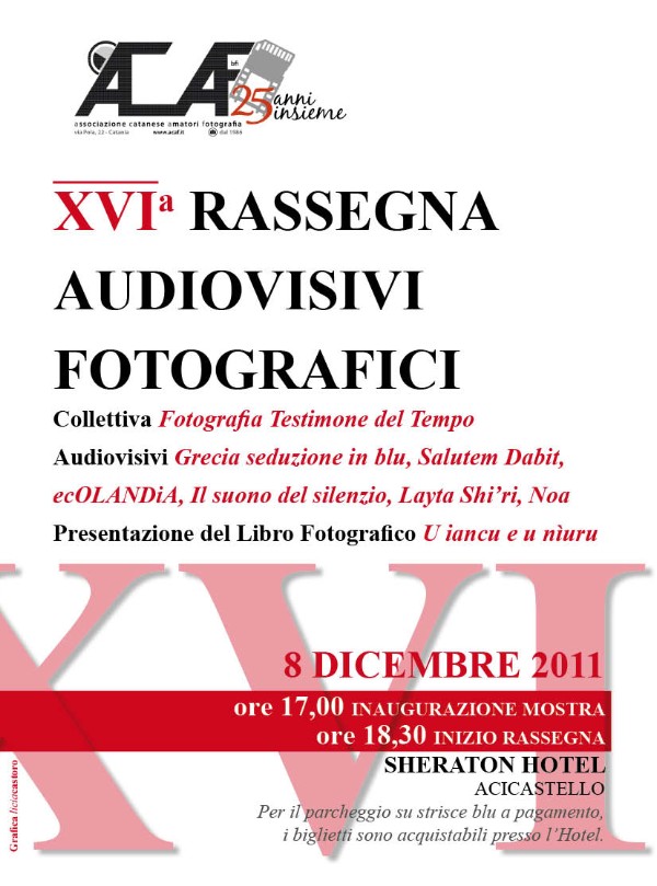 locandina-acafPer gli amanti della fotografia segnaliamo per il giorno 8 dicembre un’iniziativa della Associazione ACAF (Associazione Catanesi Amatori della Fotografia) che in occasione dei festeggiamenti per il 25° anno di attività propone la mostra collettiva ” Fotografia testimone del tempo ” e la presentazione del nostro primo libro fotografico ” U iancu e u nìuru “realizzato con le immagini dei soci ma anche con le immagini dei grandi maestri della fotografia che in questi anni hanno ricevuto il premio FotoArte Sicila creato dall’Aacaf quale riconoscimento ai fotografi siciliani con notorietà internazionale . (Giuseppe Leone, Carmelo Bongiorno, Enzo Sellerio, Carmelo Nicosia , Ferdinando Scianna, Melo Minnella, Letizia Battaglia)