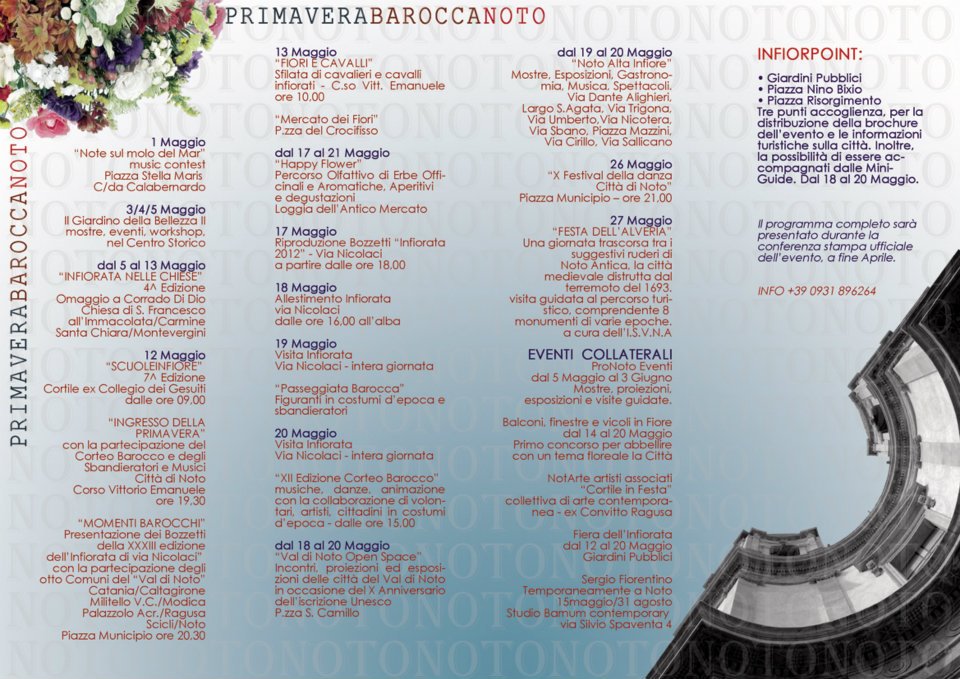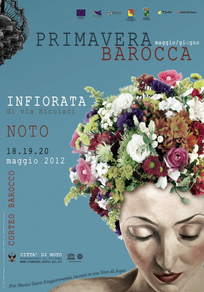 Maggio e Giugno 2012 la città di Noto (SR) presenta Primavera Barocca una manifestazione di eventi artistici, folkloristici e culturali che avrà il suo culmine con la INFIORATA di via Nicolaci nei giorni 18, 19 e 20 maggio 2012manifestazione artistica più sentita dalla città e più seguita dai turisti che si riversano da ogni parte dell’Italia e dell’Europa.