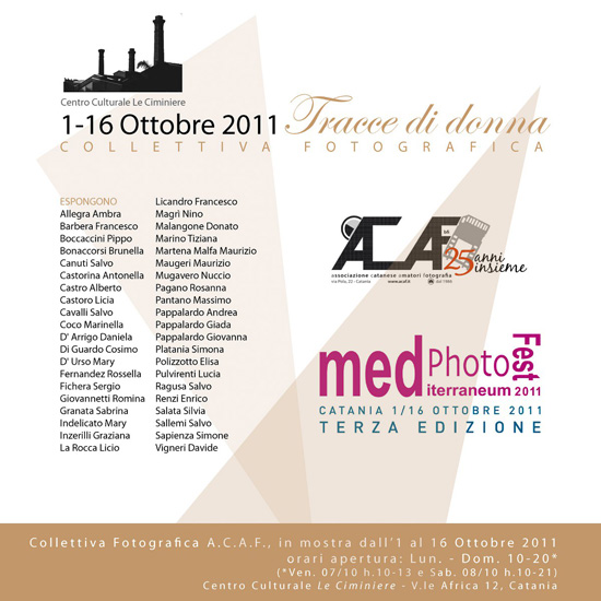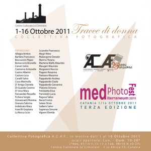A Catania, dall’1 al 16 ottobre 2011, ci svolgerà la terza edizione del MED PHOTO FEST manifestazione a valenza turistico-culturale dedicata alla Fotografia d’Autore, organizzata da Meditarraneum con il contributo della Provincia Regionale di Catania e la collaborazione di altre istituzioni pubbliche e private.