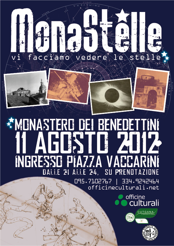 L’11 agosto 2012 il Monastero dei Benedettini di Catania, ripercorrendo una parte della sua storia che lo vide sede dell’Osservatorio Astrofisico, si trasformerà in un punto di osservazione della volta celeste per i visitatori, curiosi, appassionati del tema o semplici “romantici”. In collaborazione con il Dipartimento di Scienze Umanistiche e la Città della Scienza dell’Università degli Studi di Catania, e con la Fondazione Cutgana, Officine Culturali aprirà le porte del Monastero dalle 21.00 alle 24.00 con una chicca tutta da scoprire: i gruppi potranno entrare ogni mezz’ora in una camera semisferica gonfiabile – il Planetario – dove personale esperto farà compiere loro un viaggio virtuale immersi tra le costellazioni; sarà possibile attraverso un allestimento conoscere la storia di “Pietro Tacchini e la fisica solare nell’ottocento”, ricostruzione dello straordinario sforzo scientifico di appassionati studiosi; infine, passeggiando per il fresco Giardino dei Novizi, dare una sbirciata “telescopica” al firmamento (se le condizioni atmosferiche e ambientali lo consentiranno).