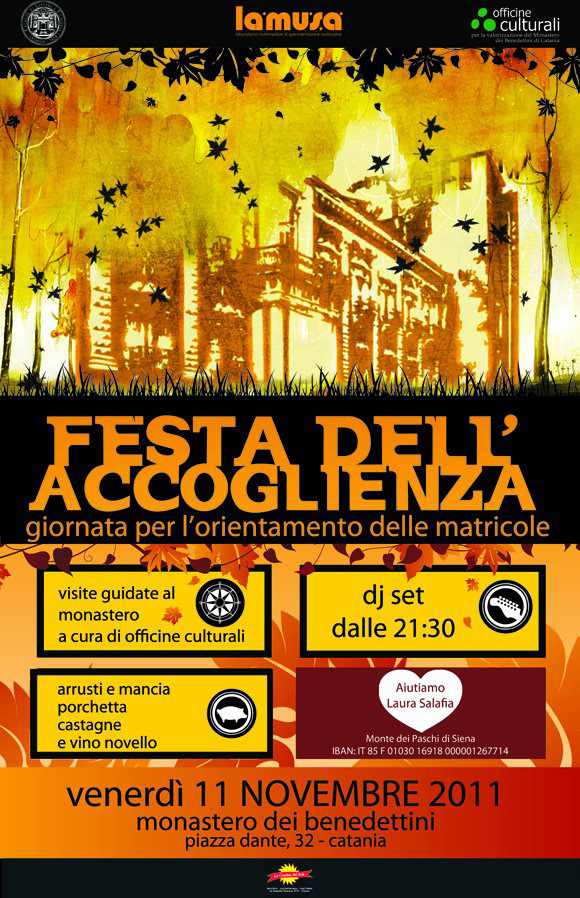 festa-accoglienza-matricole-catania-locandinaIn occasione della ricorrenza di San Martino, venerdì 11 novembre, la facoltà di Lettere e Filosofia accoglierà le matricole dell’anno 2011/2012 organizzando, nella meravigliosa esedra di piazza Dante, una grande festa universitaria all’insegna della musica e della convivialità.