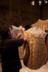 Originale ed evocativa la sua proposta di Marella Ferrera, concept creator della mostra, per le austere sale al piano terra di Castello Ursino dove , grazie alla collaborazione con il Teatro Stabile di Catania, grandi cubi in legno diventano volumi espositivi, come telai dove i fili della narrazione di “Pezze di Storia” tracciano trama e ordito. Cubi trasformati in visionarie “stanze della memoria” e veli di tulle color fango a creare una patina del tempo che sbiadisce i contorni degli oggetti e li proietta in una dimensione spazio-temporale lontana dal presente. Stanze della memoria, quelle della Ferrera, dove affacciarsi e curiosare come per gioco alla scoperta delle sorprendenti e segrete meraviglie del Castello Ursino.
