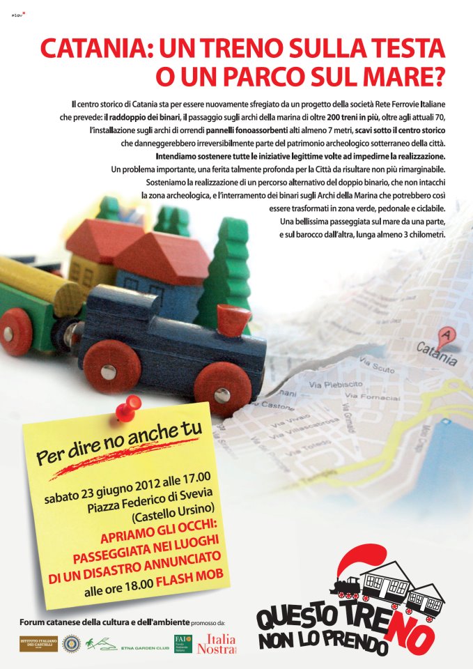 Ciò comporterebbe tra le altre cose la liberazione del viadotto sugli archi della marina per destinarlo alla fruizione come green-way, struttura qualificante per la vivibilità della quale la città di Catania è allo stato presente totalmente priva. Rilevata la realizzabilità sul piano tecnico ed economico di questa proposta alternativa con il presente documento, cui si allegano in calce le adesioni, il Forum intende sostenere senza riserve tutte le iniziative legittime volte ad impedire la realizzazione del disastroso progetto, che si vorrebbe imporre da parte di RFI, cioè di semplice raddoppio della linea esistente, per sostenere invece la realizzazione del detto progetto alternativo, che verrebbe incontro alle aspettative della comunità cittadina.