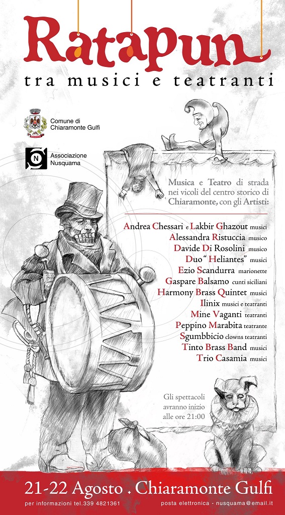 Ratapun Chiaramonte Gulfi RagusaL’associazione Nusquama con il patrocinio del comune di Chiaramonte Gulfi organizzano ”Ratapun, tra musici e teatranti”. Una due giorni dedicati alla musica e al teatro di strada che si svolgerà nelle strade e nei vicoli del centro storico di Chiaramonte Gulfi (provincia di Ragusa) il 21 e 22 agosto con inizio alle ore 21.