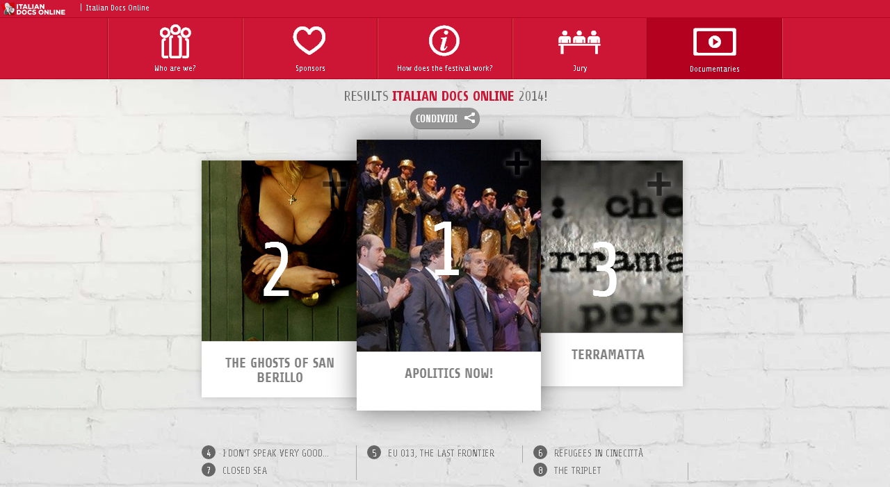 Sono tre siciliani i vincitori della prima edizione del festival #IDO14 ItalianDocsOnline 2014, il concorso organizzato dall’Italian Cinema London, che ha portato in Inghilterra i migliori documentari italiani di questo periodo. Ad aggiudicarsi il primo posto Giuseppe Schillaci con “Apolitcs Now!” ambientato a Palermo, durante le elezioni a sindaco del 2012.