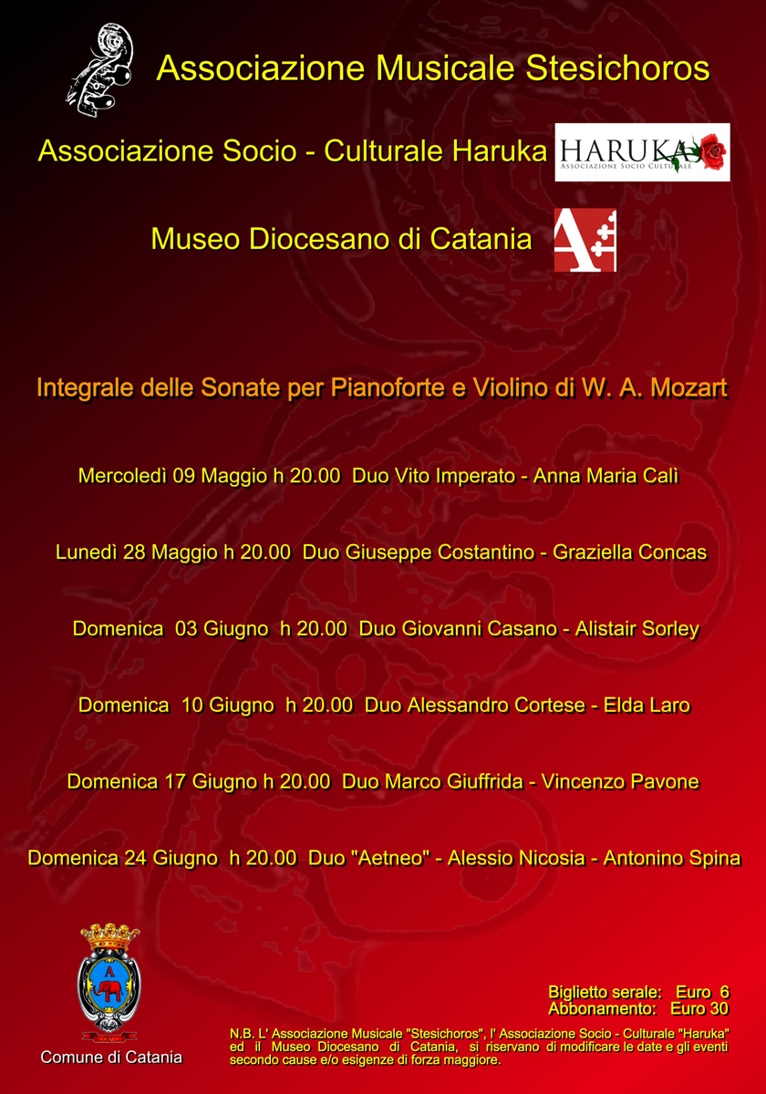 L’associazione Musicale Stesichoros, l’associazione Socio Culturale Haruka e il Museo Diocesano di Catania presentano una serie di concerti di musica classica dedicate alle sonate per per pianoforte e violino di W. A. Mozart. Dal 9 maggio al 24 giugno alla Sala Pinacoteca del Museo Diocesano.