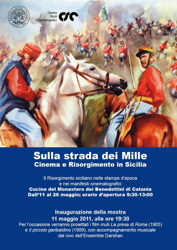 Nell’ambito del convegno internazionale sull’Unità d’Italia dal titolo “Il miglior tempo… (1848-1911)” – organizzato dalla facoltà di Lettere dell’Università di Catania, in collaborazione con la Provincia regionale di Catania e con istituzioni universitarie (i dipartimenti e i dottorati in Scienze umanistiche e Filologia moderna, la Società di Storia Patria per la Sicilia orientale, l’Accademia Gioenia di Catania), prestigiosi enti nazionali (l’Istituto storico italiano per l’età moderna e contemporanea, l’Istituto per la storia del Risorgimento italiano – Comitato di Catania), diverse istituzioni scolastiche (l’Istituto musicale “Vinci” di Caltagirone, i licei classico e scientifico di Catania) insieme all’Archivio di Stato di Catania e alla Loggia Garibaldi del Grande Oriente d’Italia – mercoledì 11 maggio alle 19:30 sarà inaugurata nelle Cucine del monastero dei Benedettini, la mostra Sulla strada dei Mille. Cinema e Risorgimento in Sicilia” .