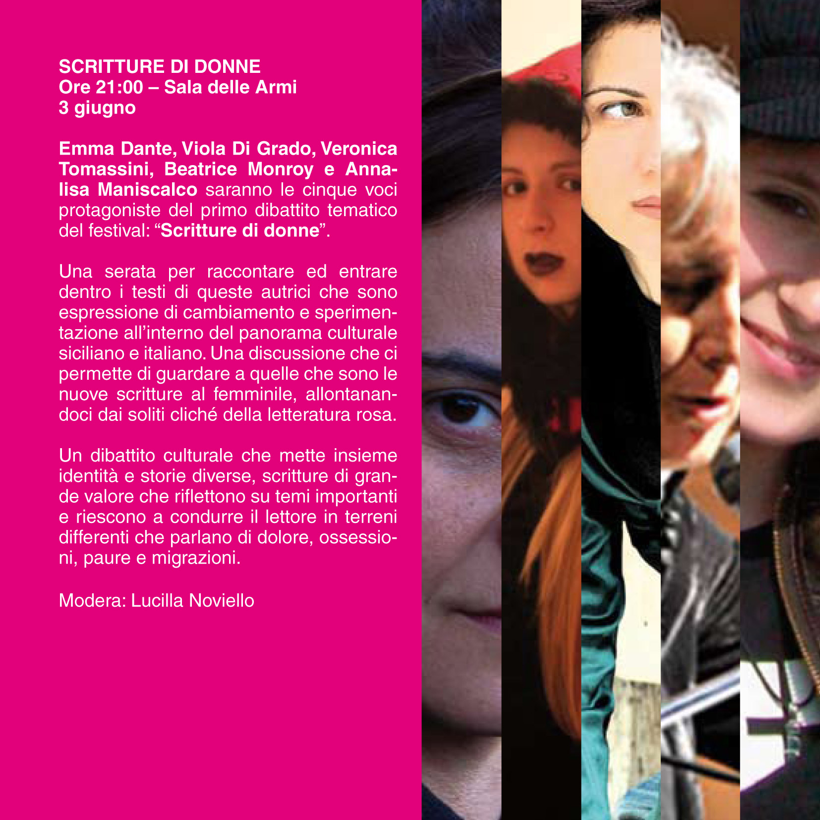 Dibattito tematico SCRITTURE DI DONNE. Intervengono: Emma Dante, Viola Di Grado, Annalisa Maniscalco, Beatrice Monroy, Veronica Tomassini. Modera: Lucilla Noviello