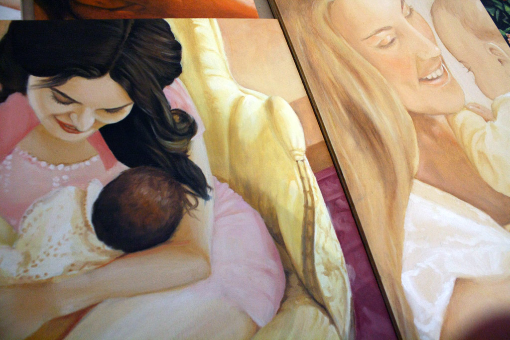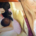 Il rapporto primordiale madre-figlio, si ripete uguale attraverso il tempo e lo spazio, circondato dal frastuono del mondo, nella straordinarietà silenziosa del gesto quotidiano reiterato attraverso i secoli ed i popoli. E ci parla di unione e di amore, di valori antichi e nuovi, di qualcosa che nasce dal piccolo e dal semplice e si espande attorno, infinito e potente, umile e forte. E’ questo attimo di grazia che interessa l’artista, nella fissazione sul dipinto del momento fuggevole e contemporaneamente eterno, per riconoscere e rendere esplicito e trasmissibile il miracolo del quotidiano.