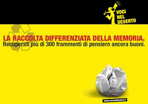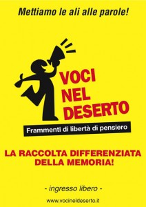 Trenta attori e un dj in scena per la Raccolta Differenziata della Memoria : “Voci nel deserto” vuole essere un appuntamento fisso con la memoria, l’ultimo venerdì di ogni mese, una sorta di rave teatrale aperto a tutti, un evento gratuito che si tiene in location non istituzionali e si alimenta dell’impegno di attori e pubblico, per una volta complici nel tenere aperto questo varco spazio-temporale tra passato e futuro.