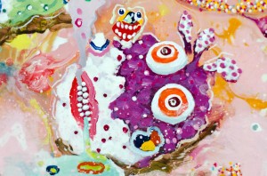 Nelle nuove tele, le foreste e le case lasciano il posto alla rappresentazione di nuove isole che in questo caso però non evocano un luogo di esilio, ma un luogo di ribollimento di nuove energie. La sfida formale di rappresentare territori d’incontro di terra e acqua, dove mapparne gli elementi stranianti, ha portato poi l’artista ad utilizzare per la prima volta la carta come altro nuovo supporto. Le sculture antropomorfe in poliuretano espanso dai colori improbabili – che nulla hanno a che fare con la tematica del grottesco – affrontano l’idea della auto-ironia che possono avere gli oggetti prodotti/usati dall’uomo e osservati da altri uomini. Questo aspetto è confermato dalla scelta dell’artista di presentarle non come un’installazione o come pittura tridimensionale, ma come reperti o oggetti museali esposti in teche o su piedistalli di metallo che ricordano i display anni sessanta. Così, queste teste che ci guardano o che si fanno guardare con una dimensione indifesa disarmante sollevano la questione in quale contesto collocarle o da quale mondo sono scaturite.